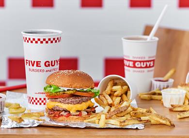 The Five Guys way is all about generosity, so expect an extra scoop of fries in the bag for you! 10 different milkshake mix-in flavours give you over 1,000 ways to make your shake, and the in-store Coca-Cola freestyle machines have over 100 different drink combinations.