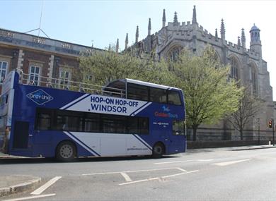 Take a sightseeing tour on board a Golden Tours open top bus (45 minutes on the bus plus hop on-hop off stops in Windsor, Eton and Datchet).